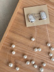 耳元には白く艶めく淡水パール
