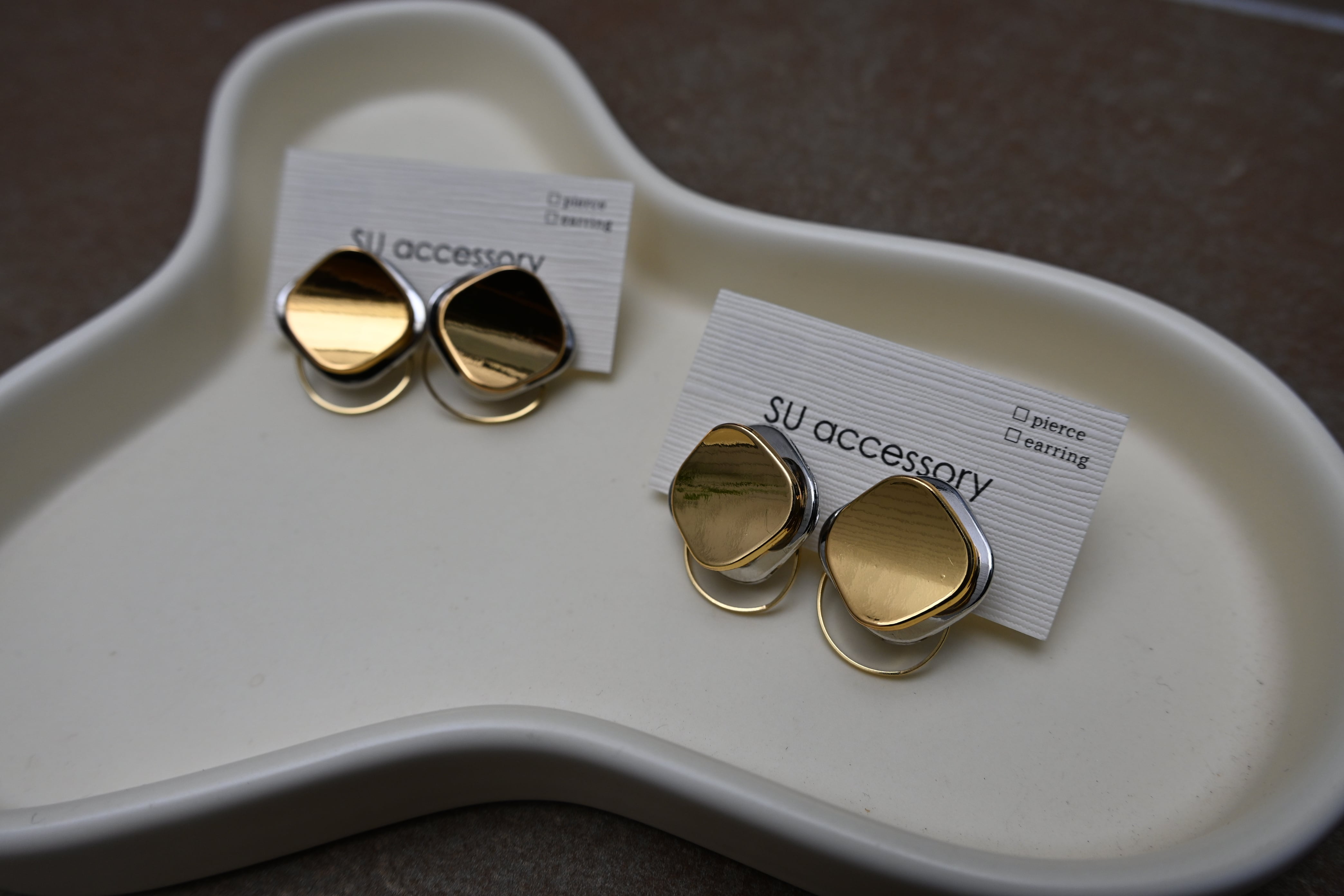 シルバーとゴールドのひし形ベースにリングを組み合わせたデザイン性のある、おしゃれアクセサリーです♡