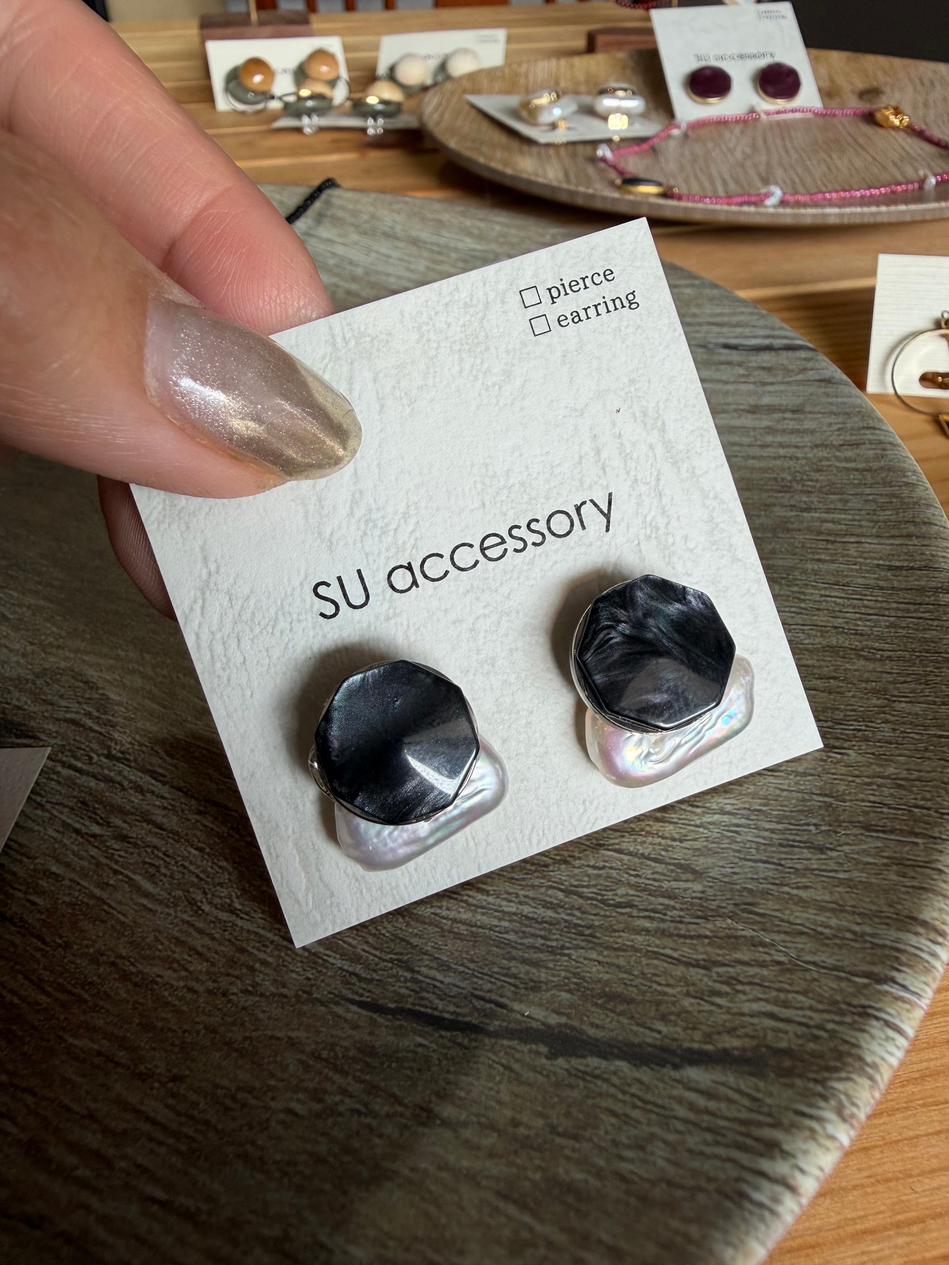 深みのあるマーブルと大ぶりの淡水パールを組み合わせたデザインアクセサリー。