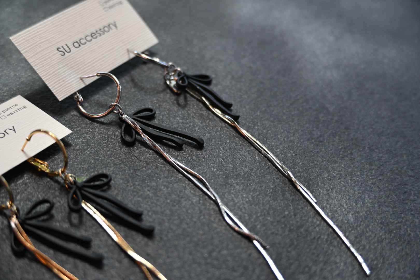 ゴールドリングにブラックリボンとゴールドチェーン、高級感のあるアクセサリーです!